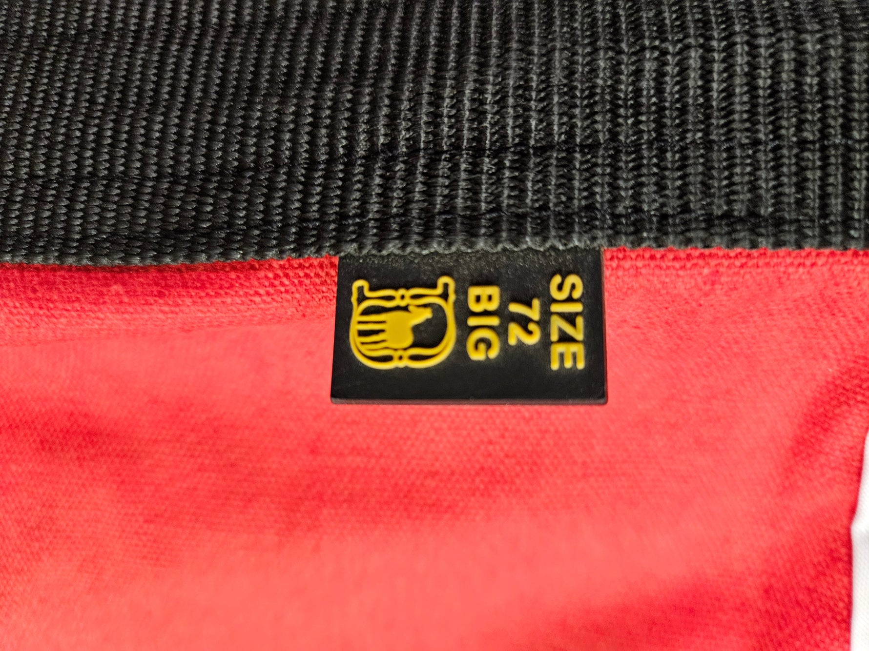 Red cotton with black trim and white piping.