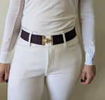 1.5" Plum adjustable riding belt for youth and adults with gold surcingle closure. The plum color is a dark plum with hint of navy.