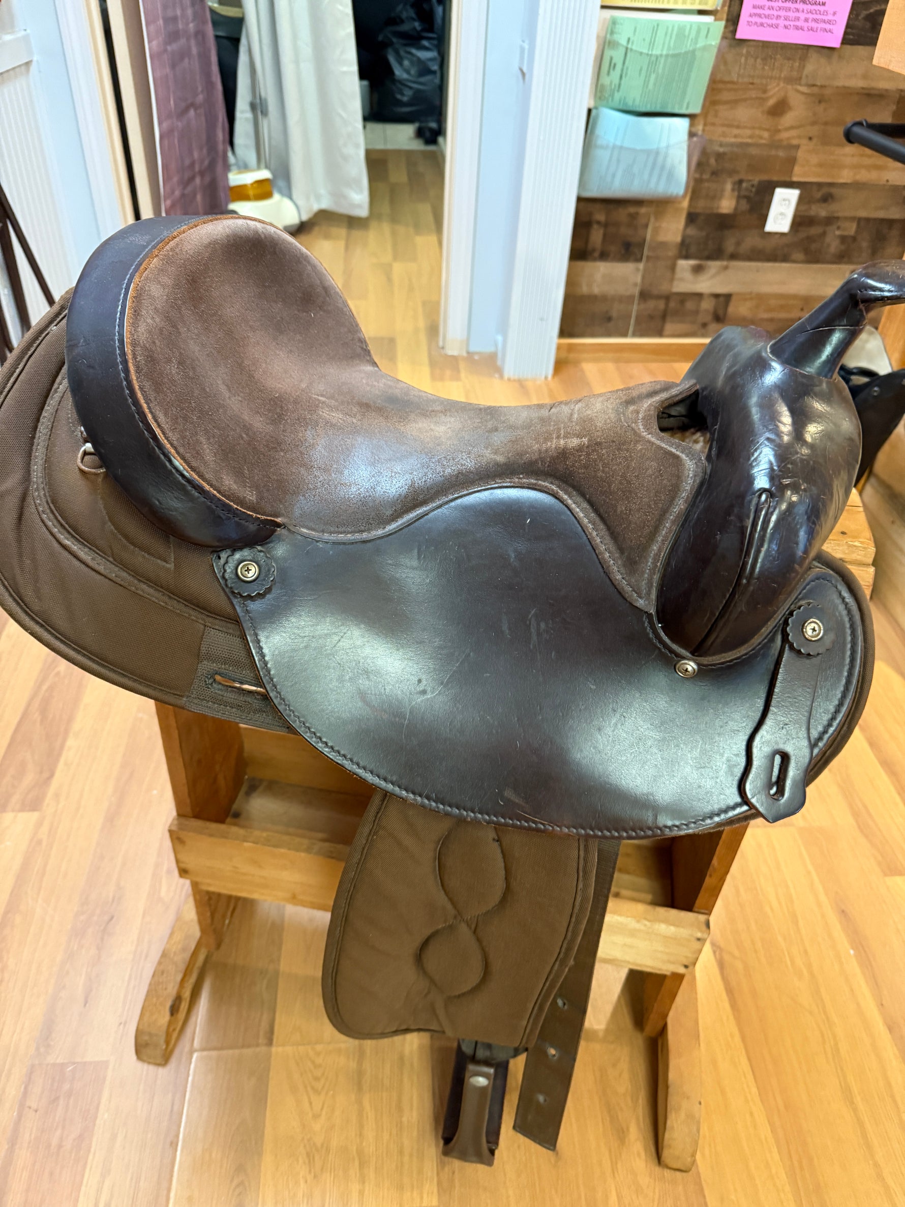 Saddle - Western 16" seat #206 Big Horn Brown Leather Light Trail Saddle Brown Leather, Cordura Fenders and Synthetic Round Shirt 7" Gullet SQHB 25" Shirt Length Retails for $1298.00 NOW 850.00