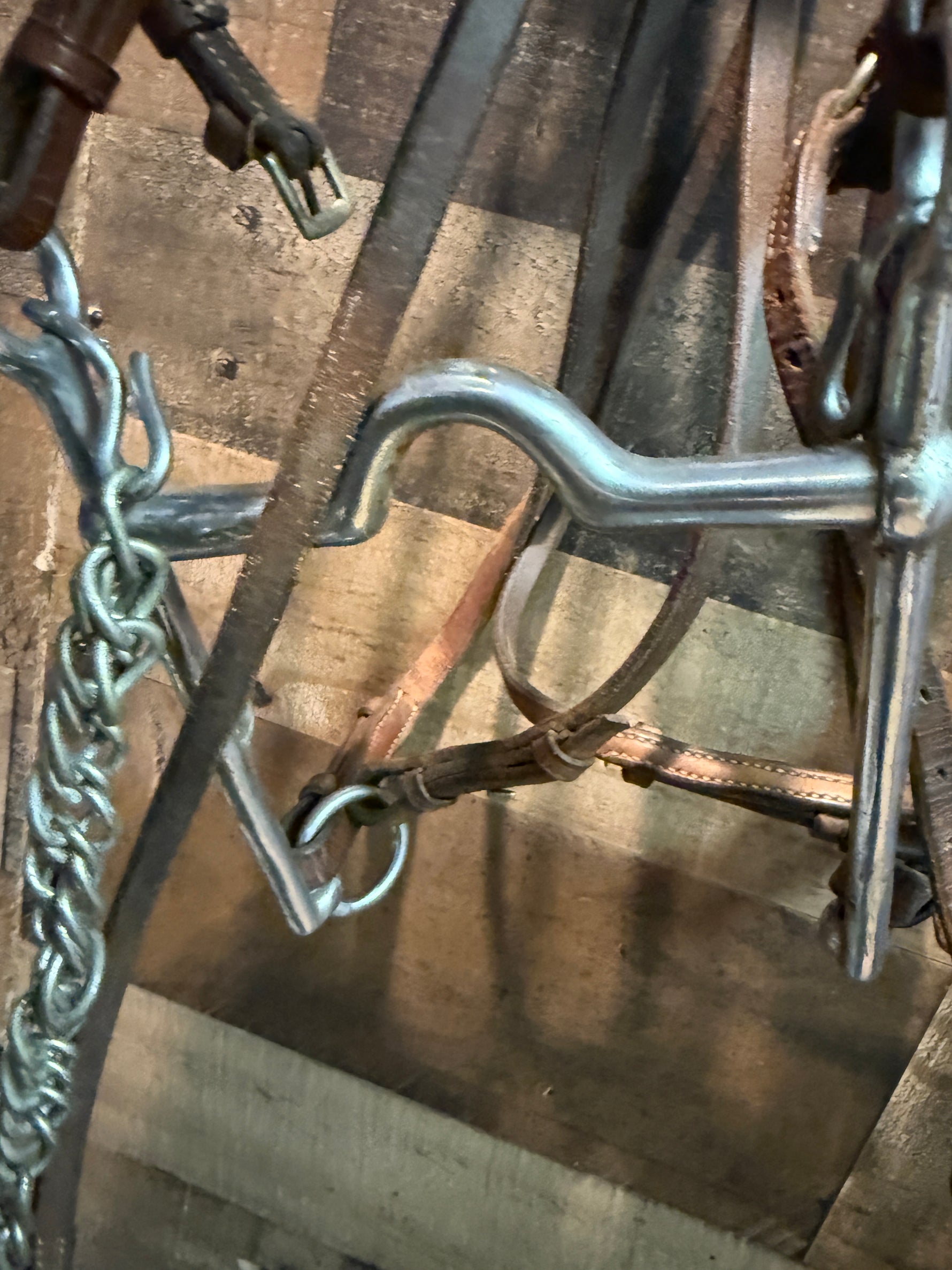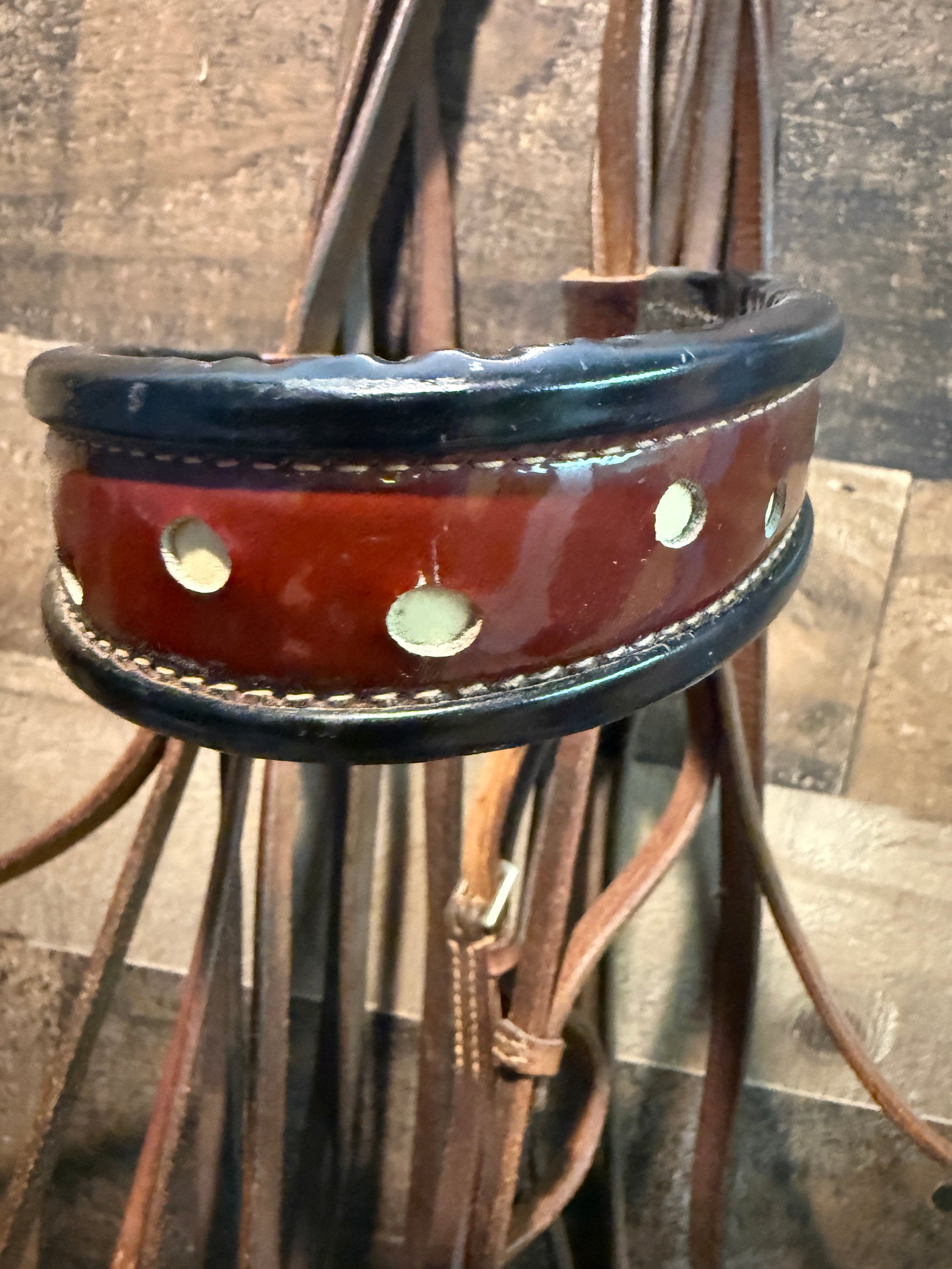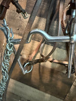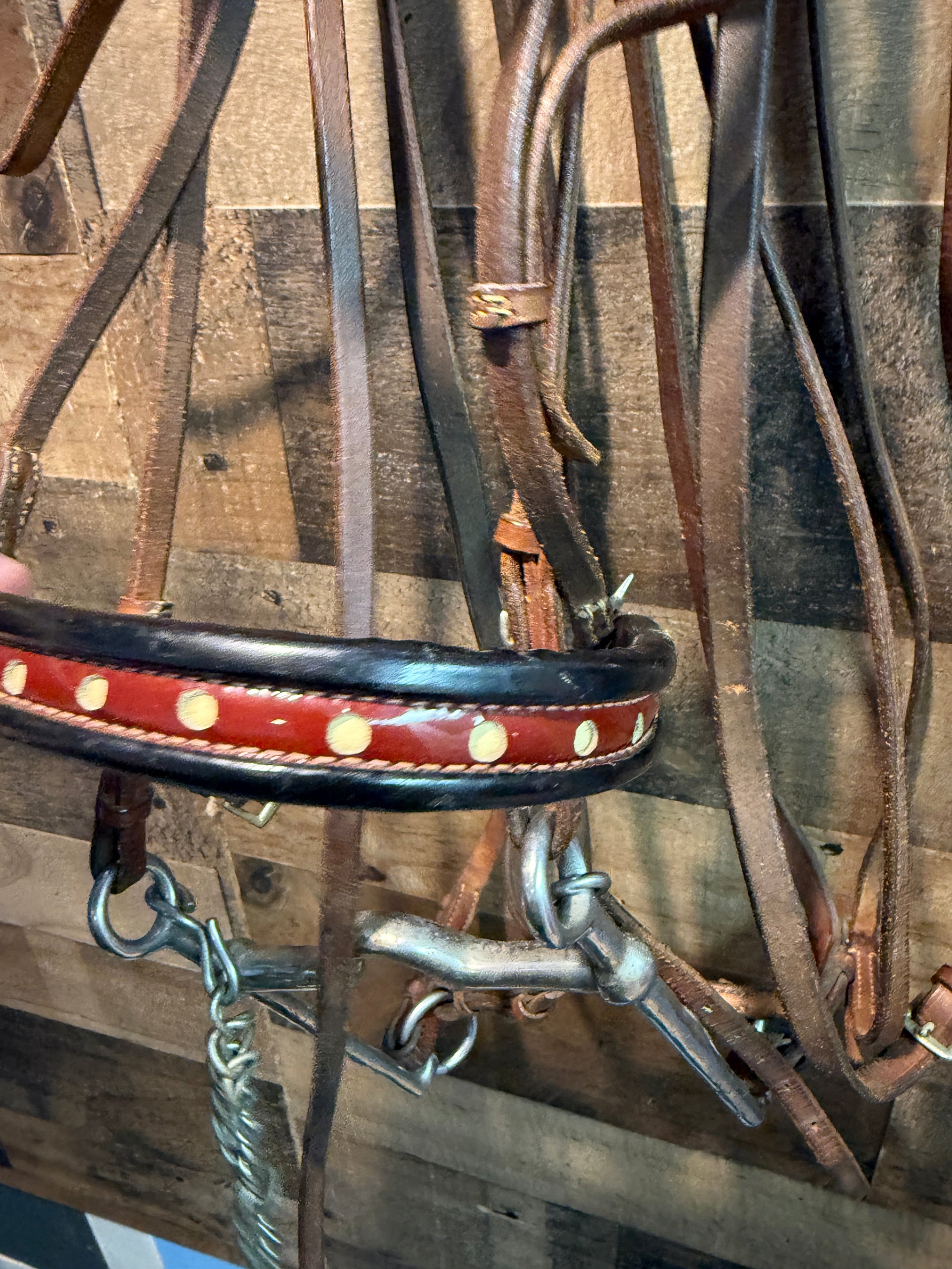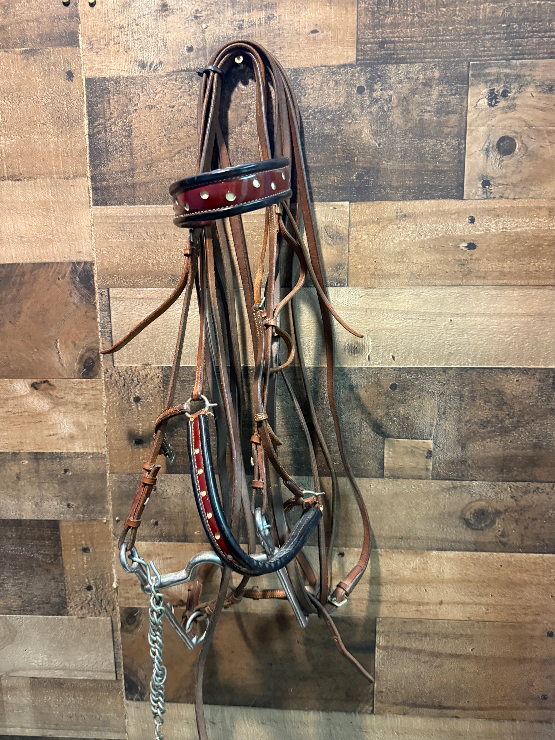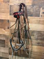 Saddle Seat Bridle with double reins and bit Red patent leather needs conditioning